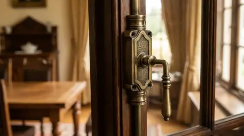 Antique Brass Lever Handle Door Espagnolette Bolt in various finishes, designed for doors up to 9 feet tall, specifically tailored for the right-hand orientation. Elevate your living spaces with this luxurious set that effortlessly combines attractive elegance with unparalleled styling.