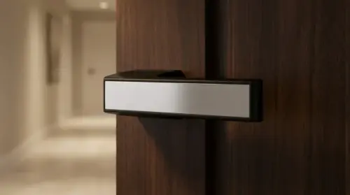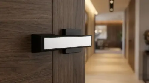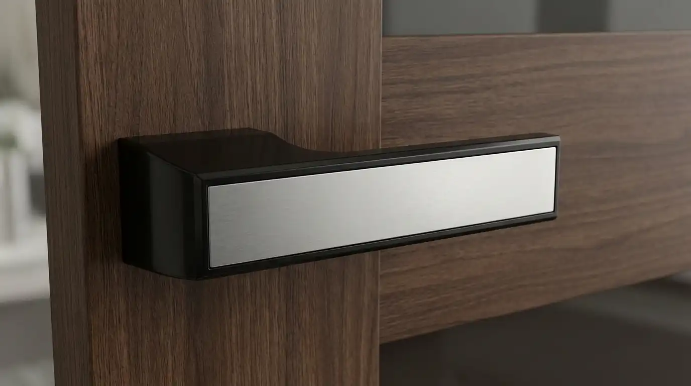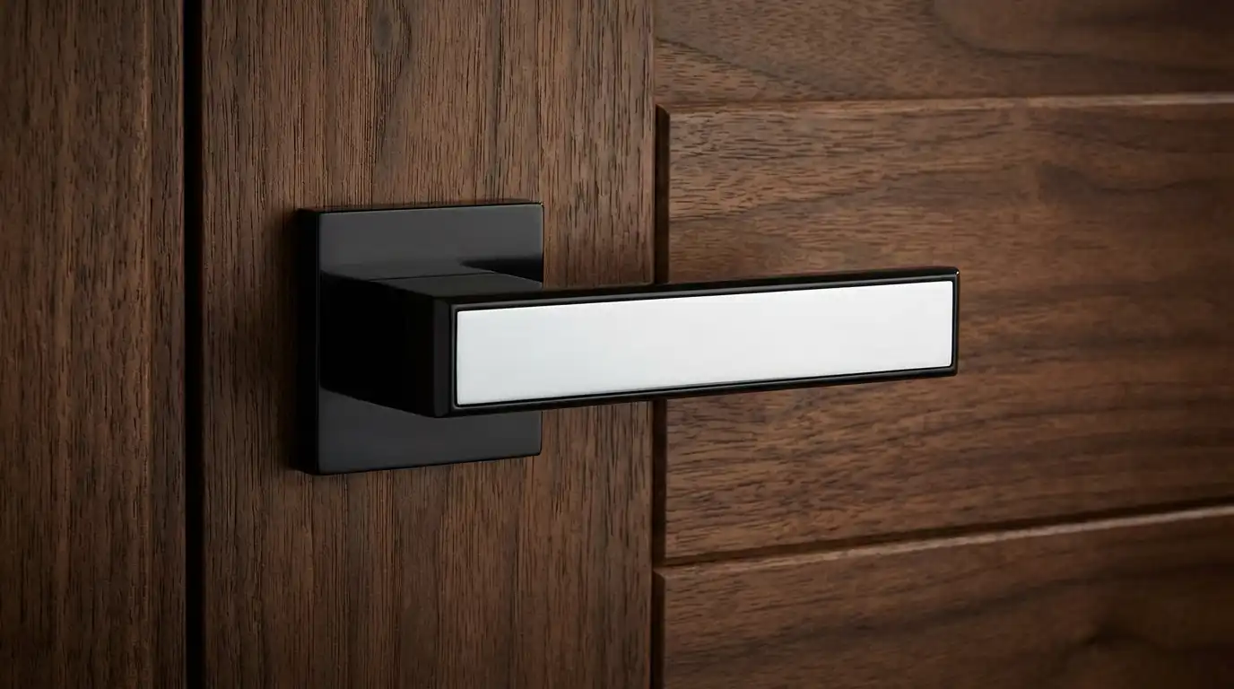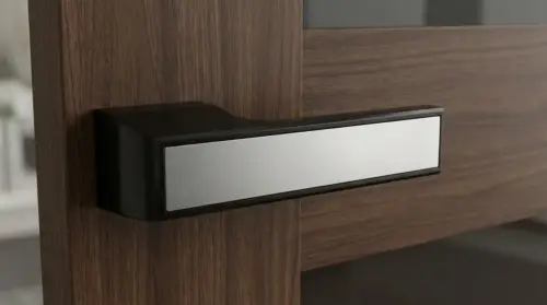 Atlantic Tupai Versaline Tobar Designer Door Handles On Rectangular Rose, Matt Black – T3089LPSSMB MATT BLACK WITH POLISHED STAINLESS STEEL DECORATIVE PLATE