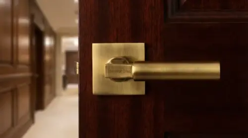 - Part of the Heritage Brass range of door handles on square rose, from M. Marcus Limited who became established in 1940 at Ironmongers Row, London