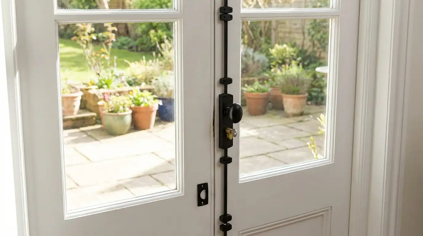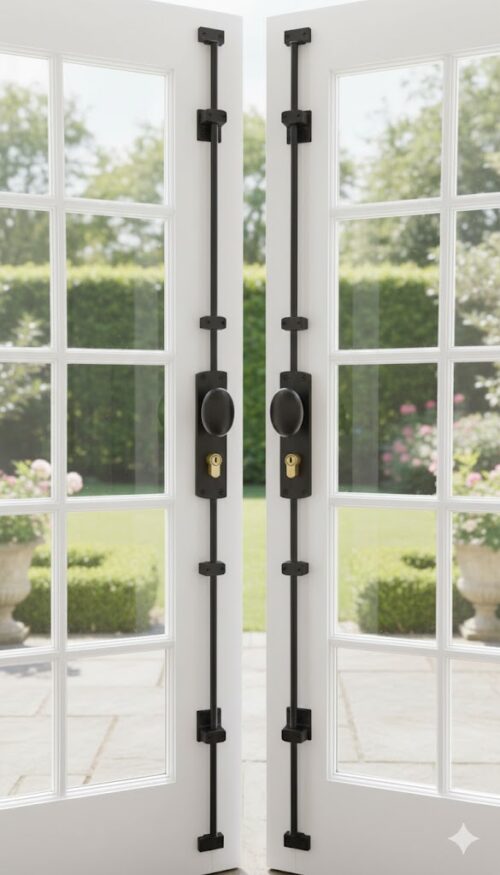 Commonly mounted on the vertical frame of French doors, enabling both the head and foot of the door to be locked in a single action -
